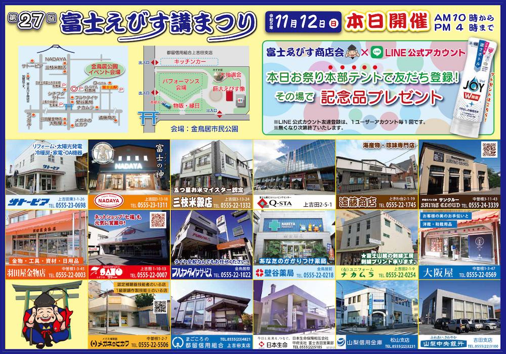 また、『富士ゑびす商店会公式LINEアカウント』店頭で友達登録で記念品を贈呈(数に限りあり、お早めに)!ぜひご来店ください!