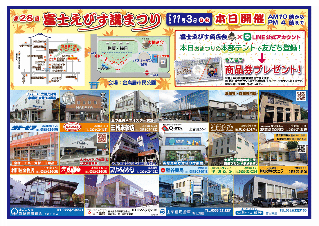 また、『富士ゑびす商店会公式LINEアカウント』と友だち登録がまだの方!加盟店店頭または、当日会場の本部テントにお越しの上、友だち登録で商品券を贈呈します!