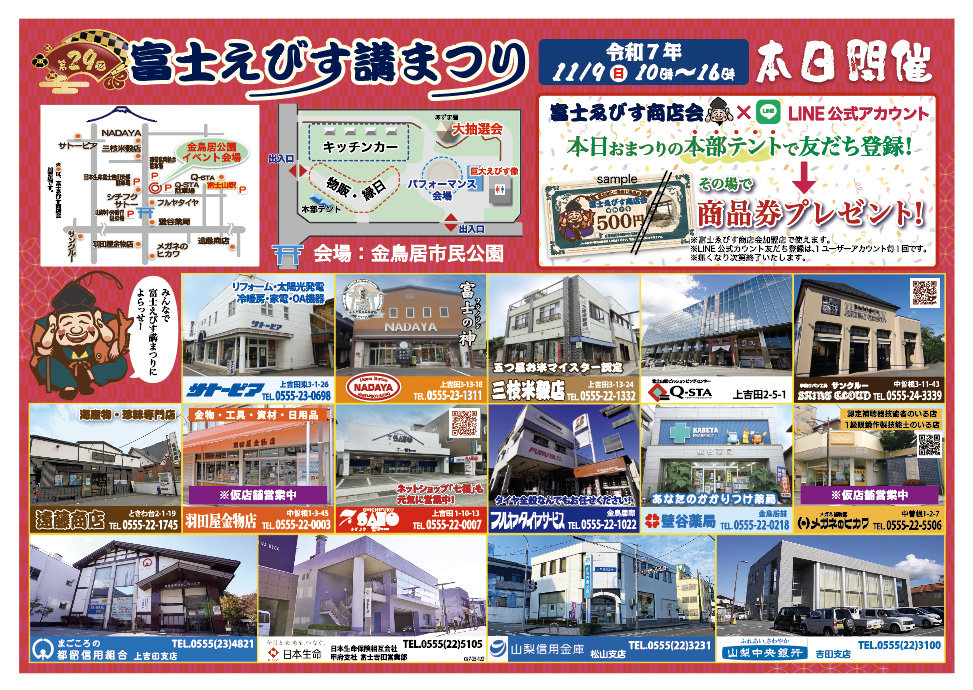 また、『富士ゑびす商店会公式LINEアカウント』と友だち登録がまだの方!加盟店店頭または、当日会場の本部テントにお越しの上、友だち登録で商品券を贈呈します!